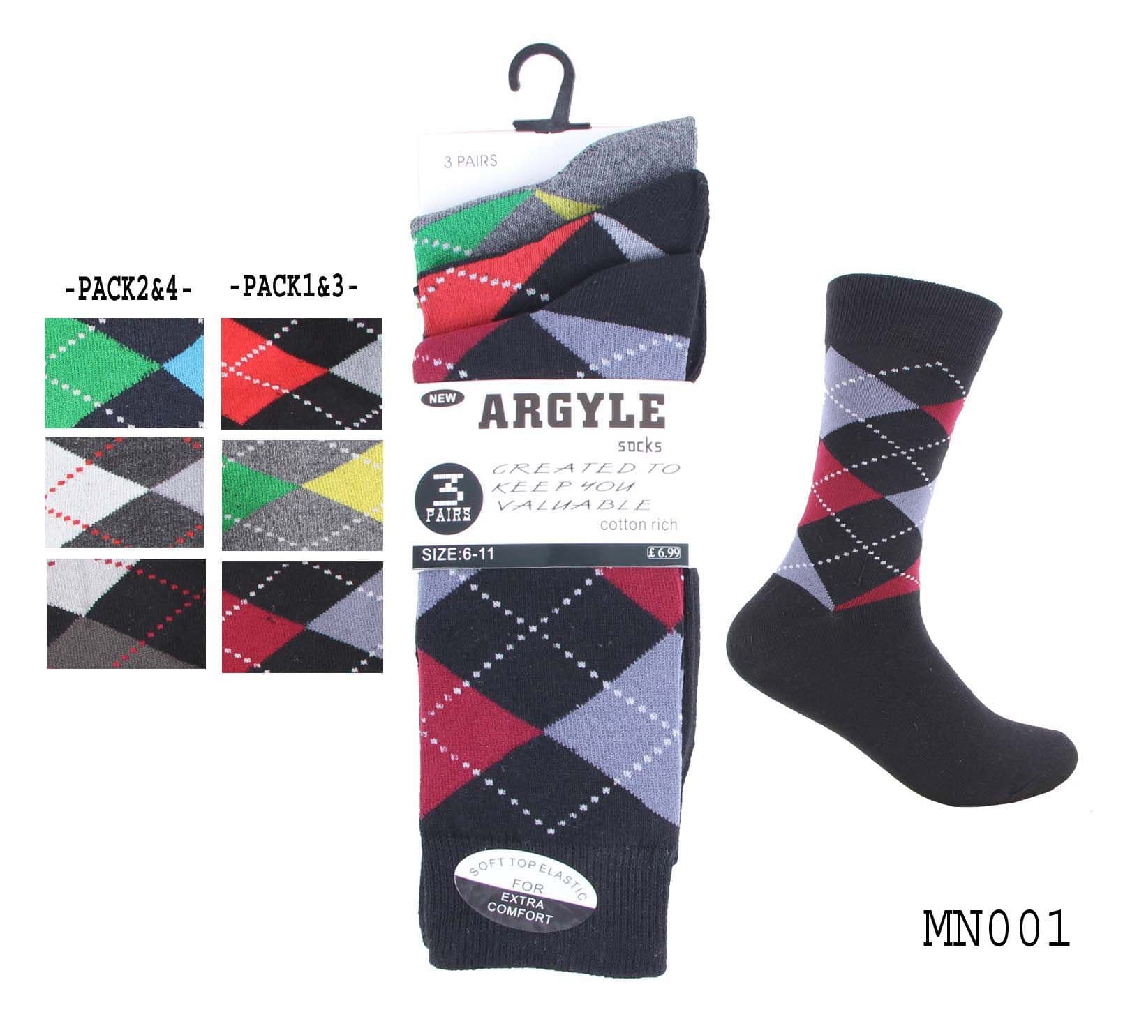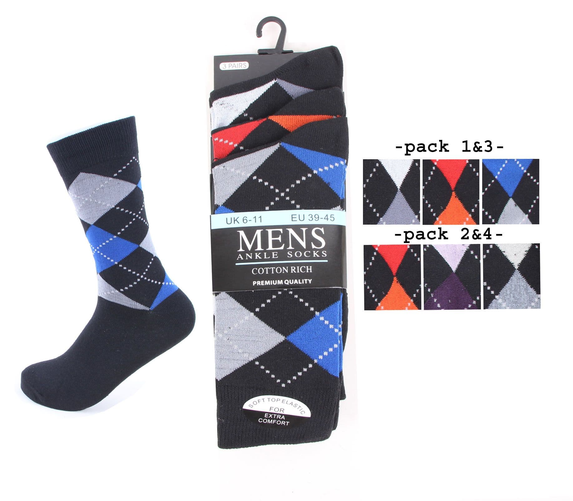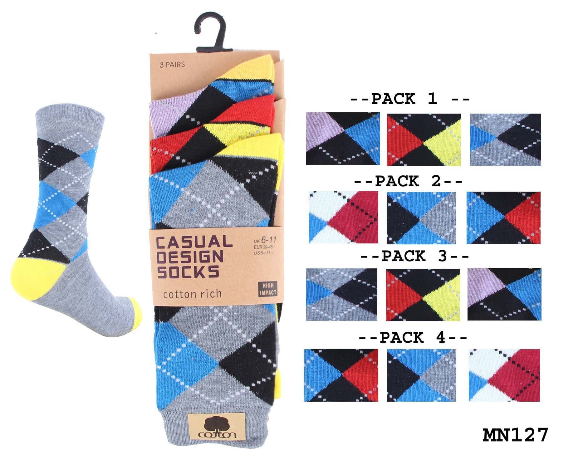 Mens 3 pairs diamond assorted colours socks